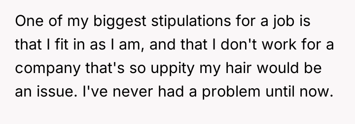 The original poster is facing a conflict where their long-held personal expression, specifically their distinct hair color, clashes directly with the perceived strict professional standards of a potential employer. Despite having significant professional experience, the OP is emotionally positioned to defend their right to self-expression, leading to a sharp confrontation when the interviewer made unsolicited, critical remarks about their appearance.