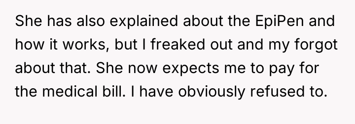 The original poster (OP) is caught between their roommate's expectation that they should have managed the childcare situation and administered the EpiPen, and the OP's own reaction of panic and subsequent refusal to cover the resulting medical bills. The central conflict revolves around shared responsibility for a child's safety, the failure of established communication methods, and the financial consequences of an emergency.