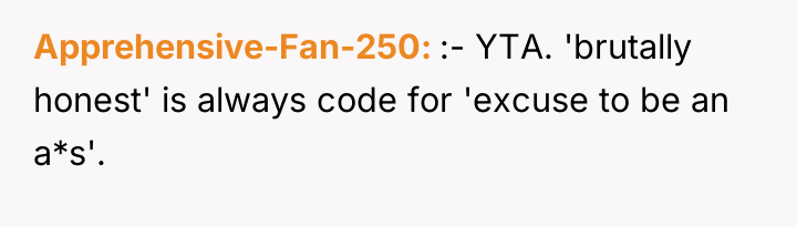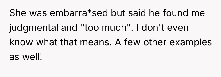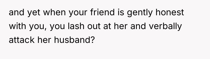 Ally’s decision to conceal Matt’s negative feelings ("he found you judgmental") for years suggests an effort to manage conflict and protect both her partner's comfort and her friendship with the OP, a common pattern when individuals fear direct confrontation. However, this created a significant asymmetry of information, damaging the OP’s sense of trust when the truth emerged. The OP’s strong reaction, while understandable given the feeling of betrayal, exacerbated the issue by leading her to repeat the very behavior Matt disliked—offering unsolicited, critical 'home truths' about him.