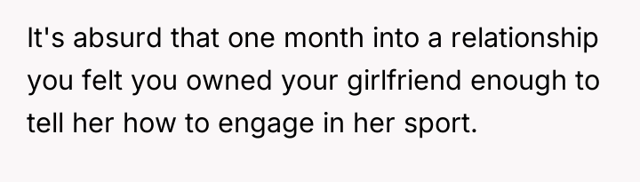 The OP's reaction stems from an emotional attachment combined with a perceived duty to protect, framing his girlfriend’s routine as inappropriate and comparing it to stripping. This projection suggests insecurity or a mismatch in values regarding public expression and professional performance. The girlfriend correctly identified this as 'overstepping your bounds'; her routine was established with coaches and is part of her athletic presentation, not necessarily an indicator of her private feelings or commitment to the OP. When the OP insisted his role was to police her behavior, he disregarded her established professional context and autonomy, leading to an immediate breakdown in communication and the cancellation of their date.