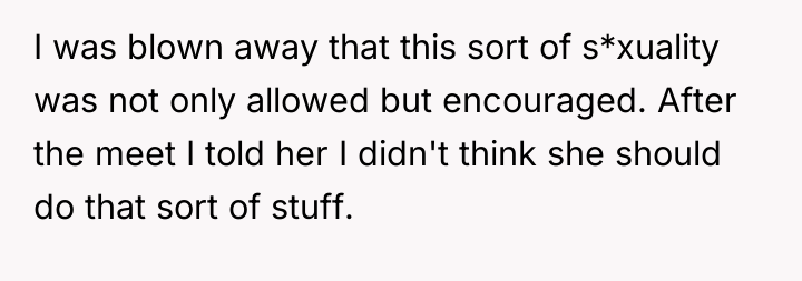 The OP’s actions in telling her the routine should be 'less sexy' were inappropriate for a one-month relationship, especially concerning her established athletic career. A constructive approach would involve the OP focusing on his own feelings without demanding behavioral change from her. He should communicate, "I felt uncomfortable watching that," rather than, "You should not do that." Future handling of value clashes should prioritize open discussion about personal comfort levels without attempting to control the partner's actions or career choices.