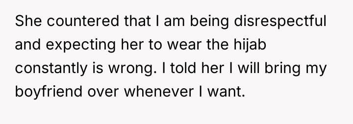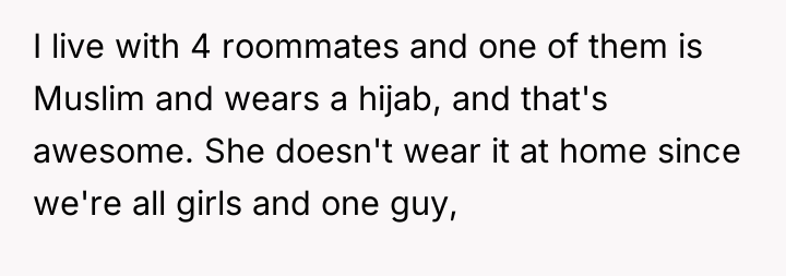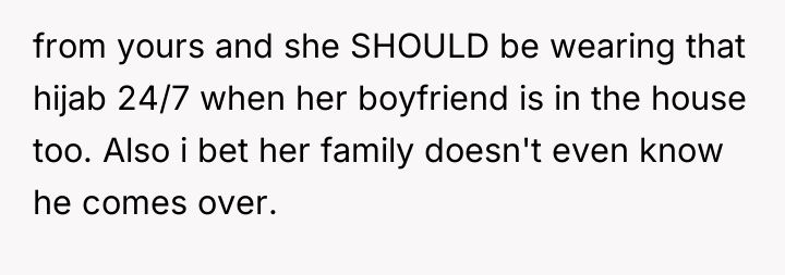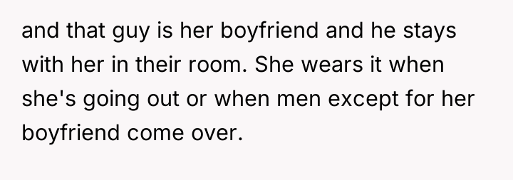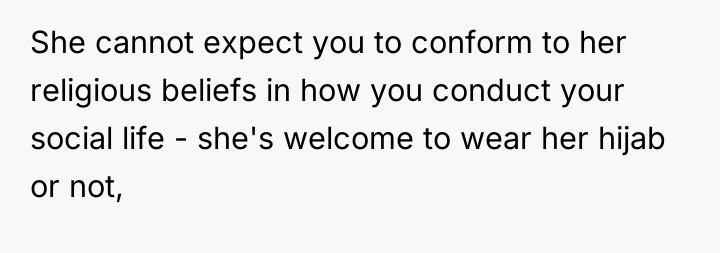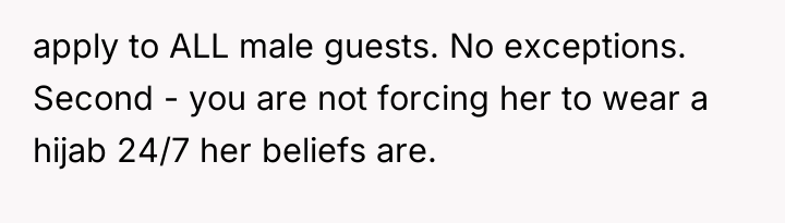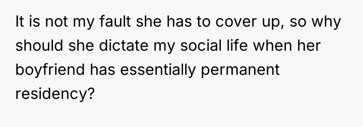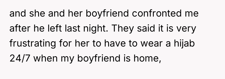 This situation highlights a complex intersection of religious accommodation, shared tenancy agreements, and evolving relationship dynamics. The OP is correct that imposing restrictions solely based on their partner's presence when another resident's partner (the roommate's boyfriend) is essentially a permanent, non-paying guest, suggests an imbalance in expectations. The roommate's need to wear the hijab when non-familial men are present is a deeply personal religious requirement. However, the standard for the household seems already set by the presence of the roommate's boyfriend, who, according to the edit, lives there full-time and represents a constant presence of a non-familial male. The roommate's request effectively asks the OP to take on the entire burden of managing her religious comfort by limiting their social life, while her own long-term guest's presence has presumably established a different baseline for the shared space.