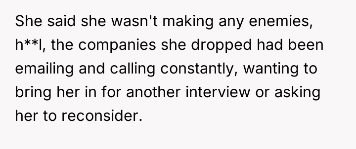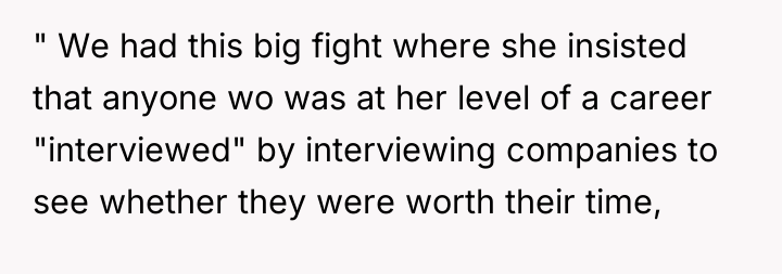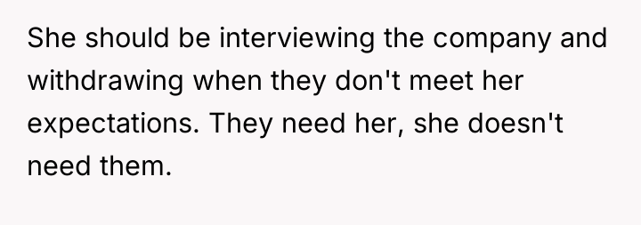 The poster's reaction stems from a common misunderstanding of power dynamics in modern, specialized hiring. He views her actions through a traditional lens where the candidate must be entirely compliant and eager. The girlfriend is operating under the principle of 'reverse interviewing,' which is common among top talent. The poster's insistence that he knows better about her career is counterproductive and likely escalated the conflict. For future situations, the poster should aim to support his partner's assessment criteria rather than imposing his external fears onto her specialized career strategy. Constructively, he should acknowledge that her primary goal is finding the *right* job, not just *any* job.