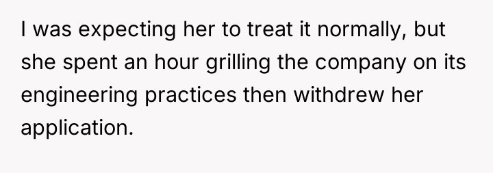 The girlfriend's behavior, while appearing confrontational to her partner, strongly suggests she is prioritizing cultural fit and ethical standards over merely securing immediate employment. In specialized, high-level engineering fields, candidates often possess significant leverage. Her pattern of asking detailed questions about engineering practices and withdrawing when concerning information (like unsafe barge incidents) is revealed indicates a focus on long-term career sustainability and avoiding toxic environments, aligning with Dr. Kaye's assertion that poor processes drive turnover. The fact that companies continued to pursue her after initial rejections reinforces her leverage and suggests her critical stance is not universally penalizing her reputation, but rather filtering out undesirable matches.