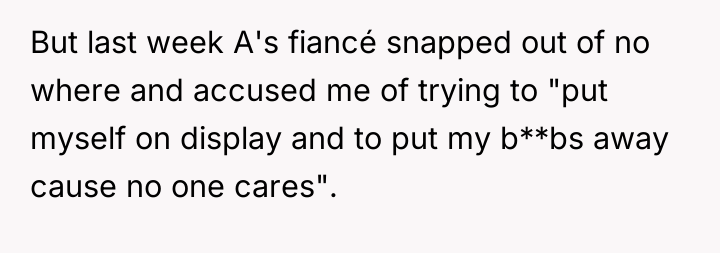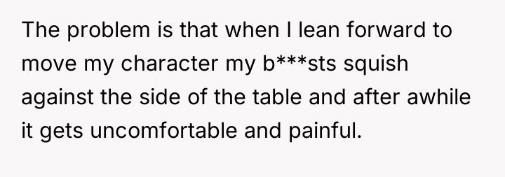 The original poster (OP) is facing a serious conflict within their long-standing Dungeons&Dragons group due to an intrusive and hostile accusation from the host's fiancé regarding the OP's posture while playing. The OP's action was purely a physical adjustment for comfort due to a medical condition (large breasts causing pain when leaning over the specialized gaming table), yet the fiancé interpreted this adjustment as a deliberate attempt to seek attention, leading to significant emotional distress and potential exclusion from the group's meeting location.