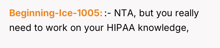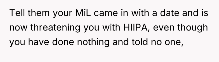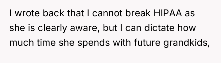 The OP was entirely appropriate in adhering to HIPAA; that boundary is non-negotiable due to legal consequences. However, the most constructive approach in future interactions would be to cease emotional engagement entirely. When faced with threats, the best strategy is often to state the boundary clearly and neutrally—such as, 'I will not discuss this outside of the professional setting'—and then implement strict communication limits. Engaging in arguments about future grandchildren only fuels the MIL's desire for control and conflict.