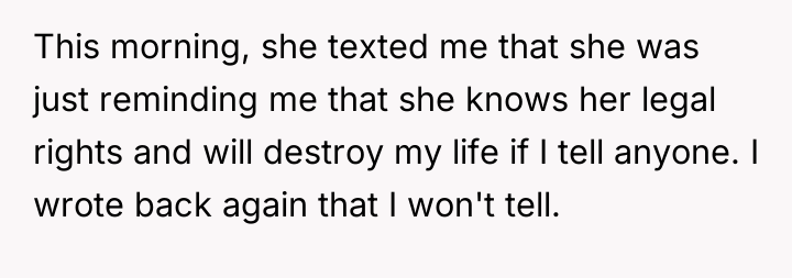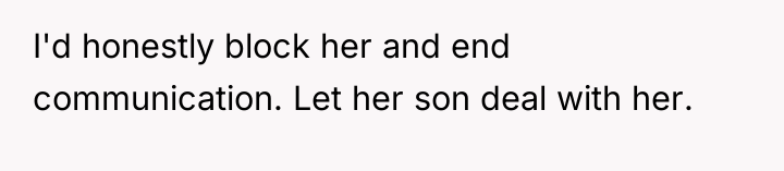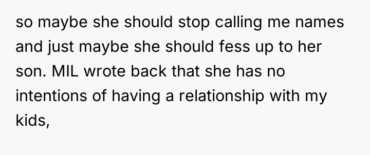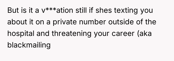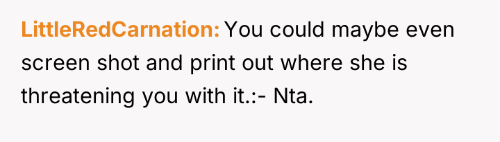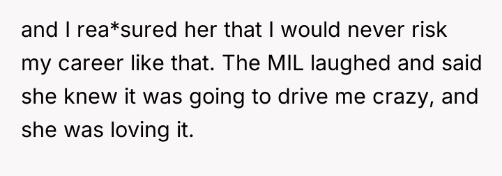 The MIL is employing classic manipulation tactics: explicit threats (destroying the OP's career) combined with psychological goading (enjoying the OP's stress and mocking the husband). The OP’s initial response, while understandable given the provocation, regrettably shifted the dynamic from maintaining professional silence to engaging in a reciprocal threat regarding future grandchildren. This move sacrifices the high ground of ethical conduct (adherence to HIPAA) for personal retaliation, potentially validating the MIL’s perception of the OP as emotionally reactive.