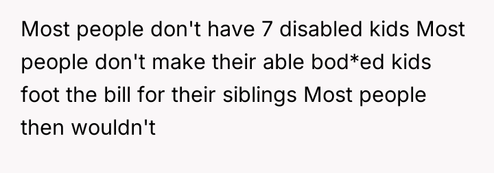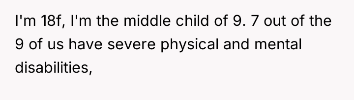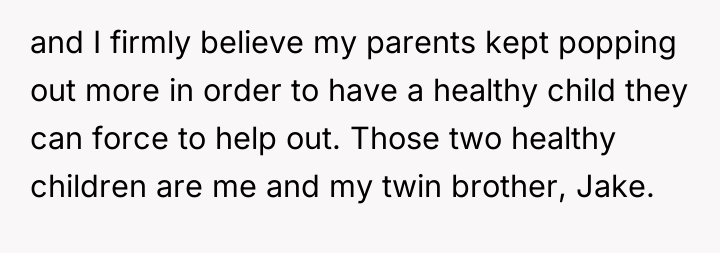 The original poster (OP) is experiencing extreme emotional distress due to the perceived exploitation of her and her twin brother's labor and finances to support a very large family, seven members of which have severe disabilities. The central conflict arises from the parents' decision to have another child despite clear financial instability and the resulting cancellation of the OP's long-planned social opportunities, leading the OP to react with extreme anger and ultimately leave home.