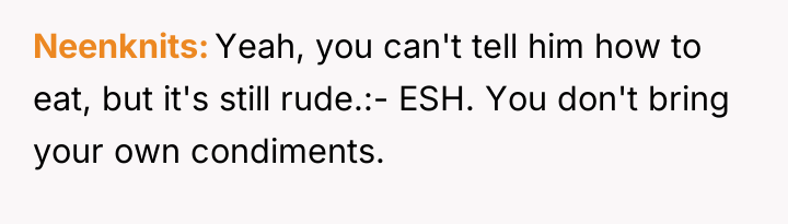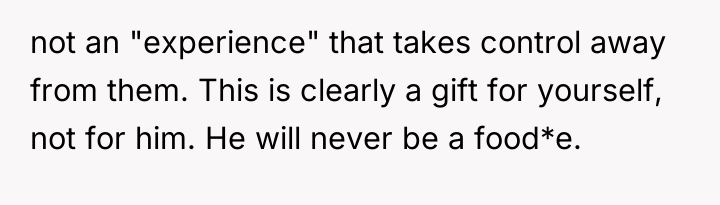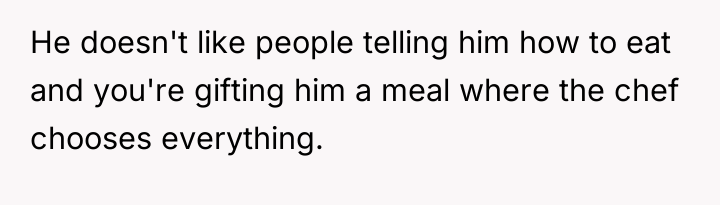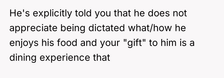 The poster's actions, while rooted in generosity, also carry an element of 'passion imposition.' While the gift itself is kind, the context suggests the boyfriend feels continually judged by the poster's superior knowledge or taste. The appropriate action would have been direct negotiation *before* booking—stating clearly that if he insists on bringing ketchup, the experience cannot proceed as Omakase. Moving forward, the poster should focus on shared activities where neither person has a significant expertise advantage, or respect the partner's stated preferences even when planning joint events.