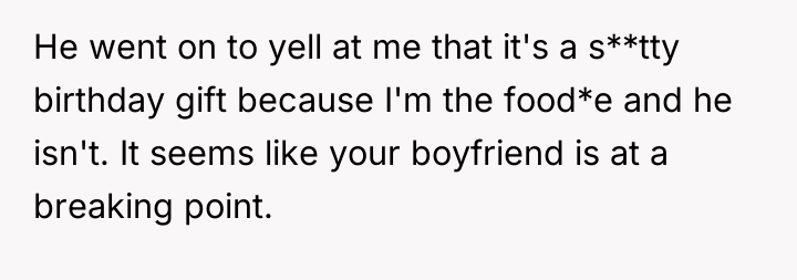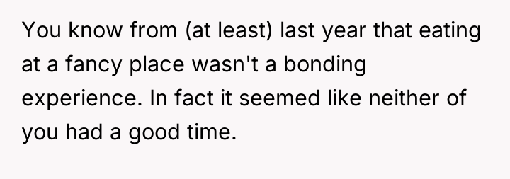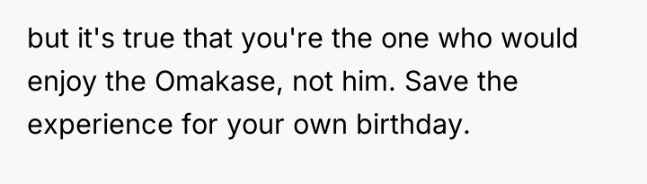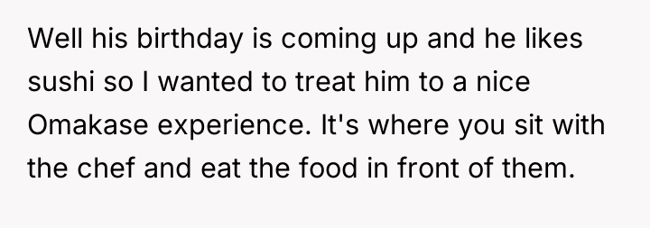 The original poster is facing a significant conflict where their effort to celebrate a special occasion with a thoughtful, high-effort gift (Omakase sushi) is being undermined by their boyfriend's deliberate, contrarian actions involving ketchup. The core issue lies in the clash between the poster's desire to share an experience aligned with their passion ("foodie") and the boyfriend's need to assert independence, even at the expense of the gift's quality or the social setting.