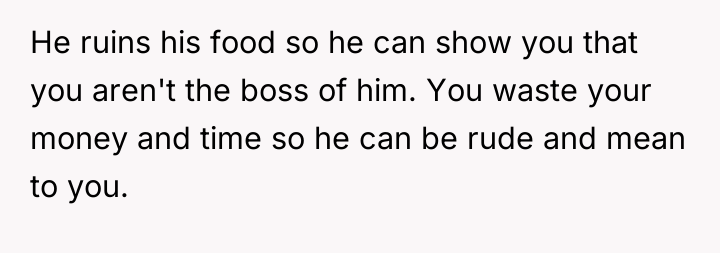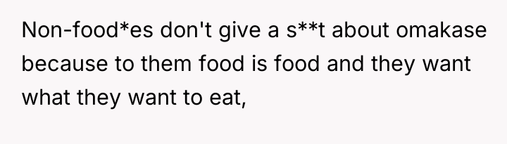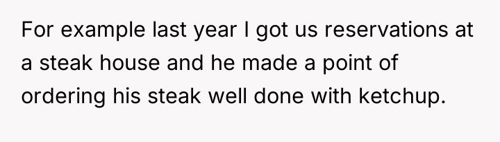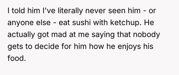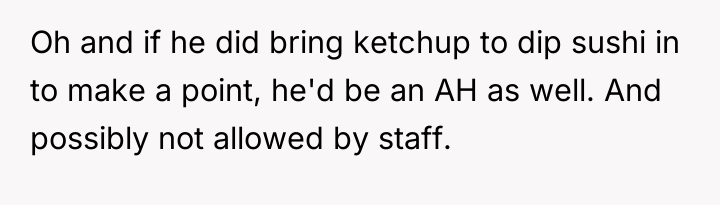 The boyfriend's behavior, exemplified by the steak incident and the current sushi demand, suggests a pattern of passive-aggressive boundary setting rather than direct communication. He weaponizes his refusal to engage with the partner's interests (being a 'foodie') by insisting on behavior that actively devalues the planned event. This often stems from insecurity or a need to rebalance perceived power dynamics, where the partner feels their own preferences are being forced upon them. The Omakase setting is particularly sensitive; it is an intimate dining experience where the chef dictates the flow, making the introduction of ketchup a significant social and culinary transgression, intentionally designed to provoke a reaction from the poster.