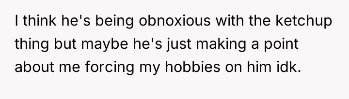 Is the boyfriend's demand to bring ketchup to an Omakase experience a genuine assertion of personal choice in how he enjoys food, or is it a manipulative attempt to sabotage an experience focused on the partner's interest? The debate centers on where personal freedom ends when it directly impacts a shared, costly, and context-specific gesture of affection.