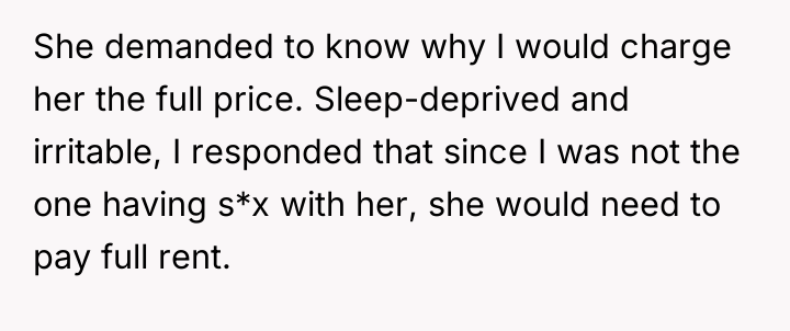 As renowned researcher Dr. Brené Brown explains, “Boundaries are the distance at which I can love you and me simultaneously.” In this situation, the OP attempted to set a necessary financial boundary, which is a standard component of maintaining clear household agreements, especially when renting space in one's own home. However, the dynamic became deeply complicated by the existing behavior—specifically the loud sexual activity—which directly impacted the OP's well-being and sleep.