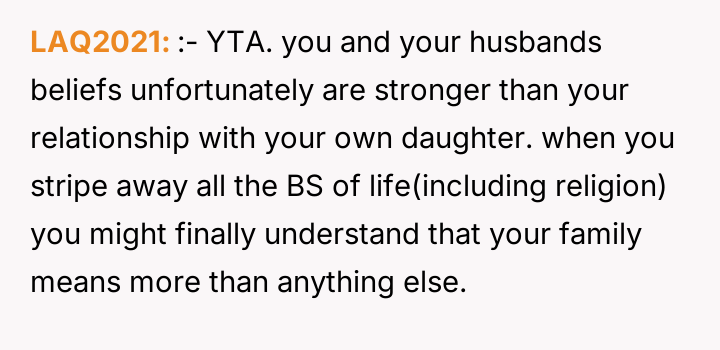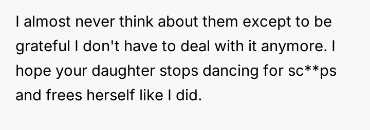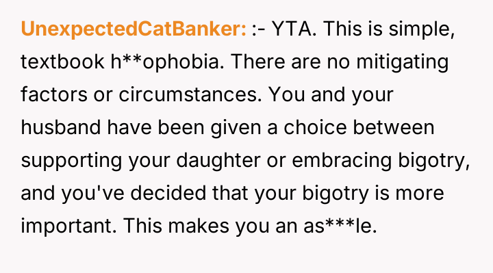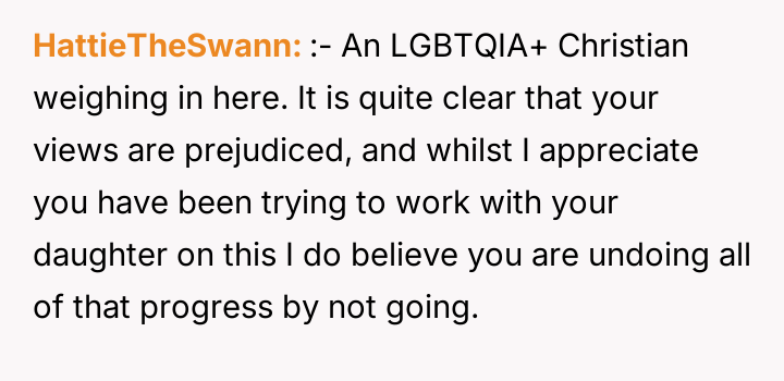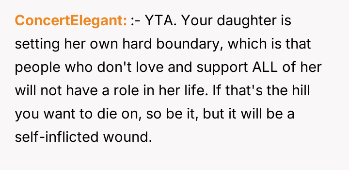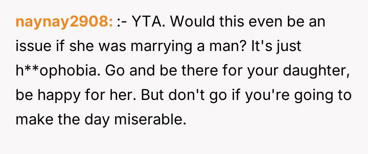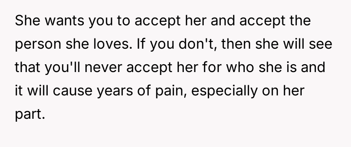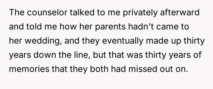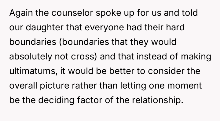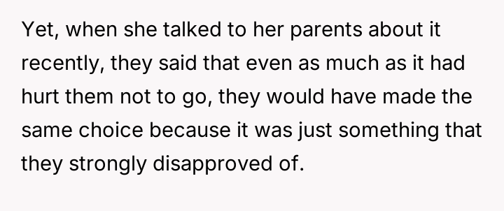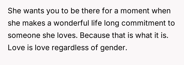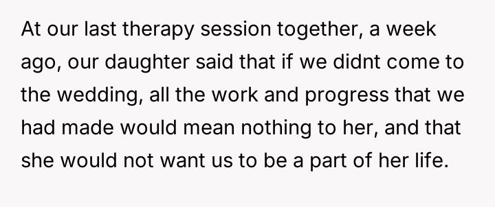 From a professional standpoint, the parents’ consistent, though limited, efforts show a sincere attempt to bridge the gap. However, their joint decision to draw a hard line on attendance, after making so much ground, has triggered the highest possible relational cost. The constructive recommendation is for the parents to explore alternative forms of affirmation that do not require their physical presence at the ceremony itself, such as sending a meaningful written message expressing love, or attending the reception only, if possible. If the hard line must stand, they must prepare for the reality of the daughter's stated consequence while continuing to communicate love outside the context of the wedding.