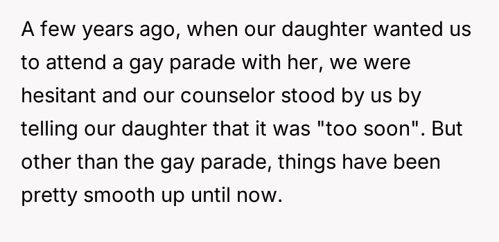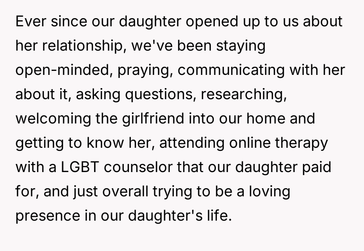 A mother and father stand at the crossroads of love and belief, striving to embrace their daughter's truth while wrestling with their own deeply held convictions. Their journey is marked by bravery and vulnerability, as they open their hearts to a world once unfamiliar, seeking understanding through prayer, dialogue, and the guidance of a compa*sionate counselor. Each step they take is a testament to their unwavering love, even when shadows of doubt threaten to dim their path.
