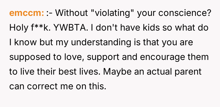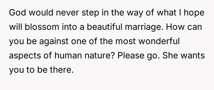 Given the daughter's ultimatum that attendance is mandatory for continued contact, versus the parents' steadfast refusal based on conscience, the central question is whether a strong moral boundary that prohibits participation in a significant life event justifies the complete loss of the parent-child relationship, or if the commitment to the relationship demands overriding those personal objections.