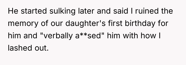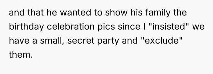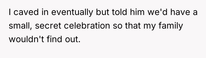 The OP's primary motivation was to maintain peace and honor her family's agreement, which is a form of self-preservation within that primary social unit. Her agreement to a 'secret' celebration was an attempt to create a temporary, localized boundary that pleased her husband while superficially respecting her parents' rules. The husband, however, showed a significant lack of emotional intelligence and respect for his wife’s position by unilaterally breaking the agreed-upon secrecy. His defensive reaction, shifting blame onto the OP for her frustration and labeling her reaction as 'verbal abuse,' is a classic deflection tactic used to avoid accountability for violating a mutual agreement. He failed to recognize that his public actions directly undermined the OP’s credibility within her family structure.