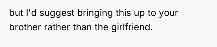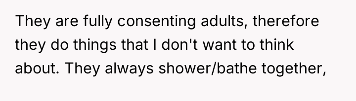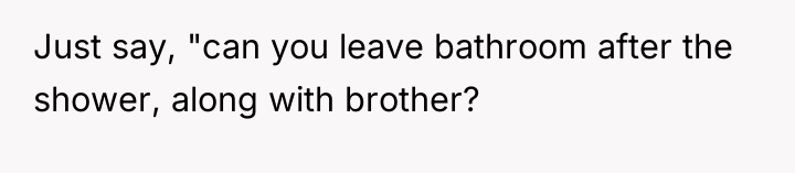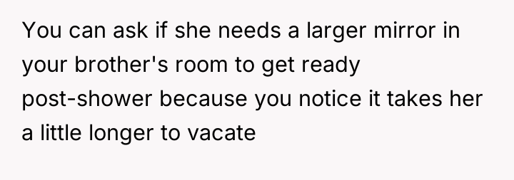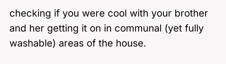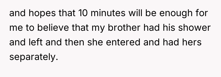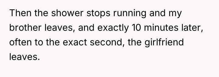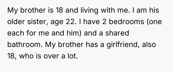 The core issue here revolves around establishing appropriate boundaries within a shared household, even when dealing with consenting adults. The OP (age 22) is functioning as a co-tenant or quasi-landlord to their brother (age 18), creating an implicit power dynamic where the OP's comfort and routine should be respected. The girlfriend's elaborate 10-minute buffer tactic indicates an awareness that her actions might violate the unstated social contract of the shared space, yet her attempt to manage the OP's perception is causing tangible inconvenience (disrupting routines, preventing the OP from using the bathroom timely).