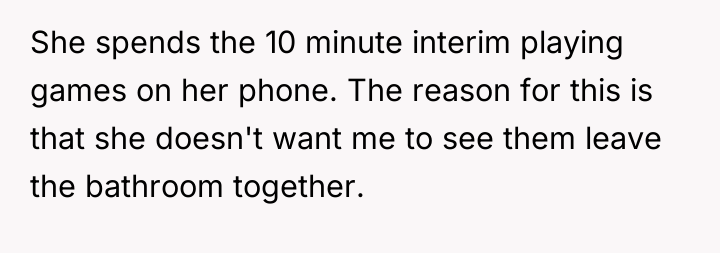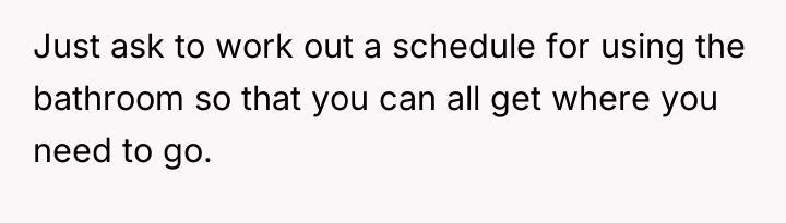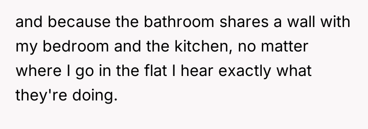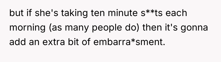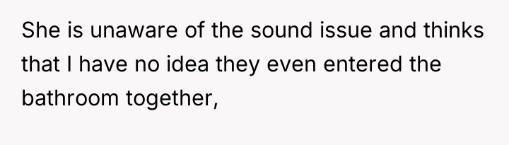 The OP's proposed confrontation addresses the *symptom* (the delay) rather than the *cause* (the combined use and subsequent secrecy). While confronting the delay is practical for immediate relief, a more constructive approach might be to establish a general house rule regarding shared bathroom use, emphasizing routine efficiency over privacy regarding the act itself. The OP should clearly communicate that the sound disruption is unavoidable and that while they respect the couple's privacy regarding their adult activities, they require timely access to the shared facility, making the 10-minute pause unacceptable for shared living standards.