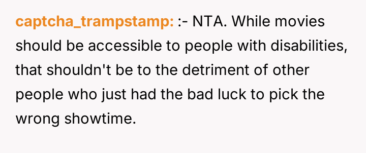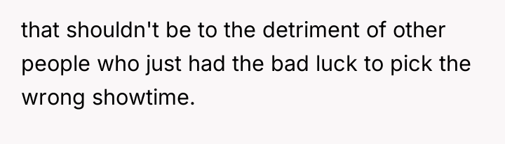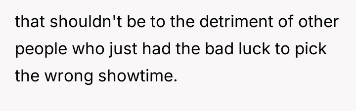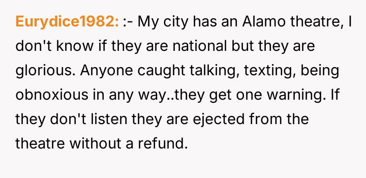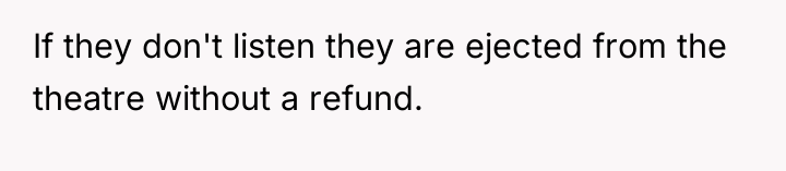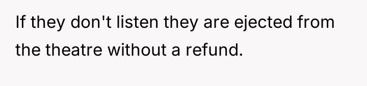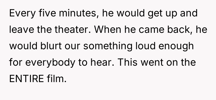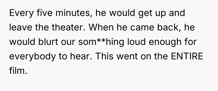 The OP's frustration is understandable; they paid for a service that was degraded by external factors. However, directly confronting or expecting immediate removal is often less effective than discreetly involving theater management, who are equipped to handle such nuanced situations. Future actions should involve communicating the issue to staff first, allowing the venue to enforce policy or offer alternatives, rather than placing the burden of enforcement solely on another patron.
