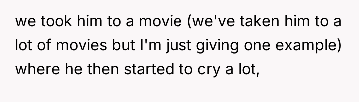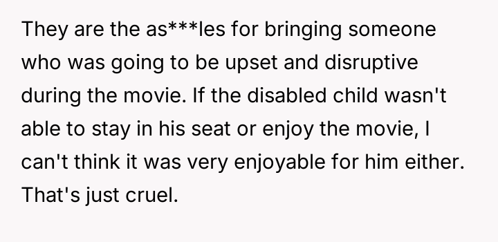 The original poster felt significant disruption and frustration due to the behavior of a child during a movie, believing the parents failed to manage the situation appropriately for the benefit of other theater patrons. The central conflict lies between the OP's right to an undisturbed viewing experience and the parents' responsibility toward their child, especially if the child has special needs.