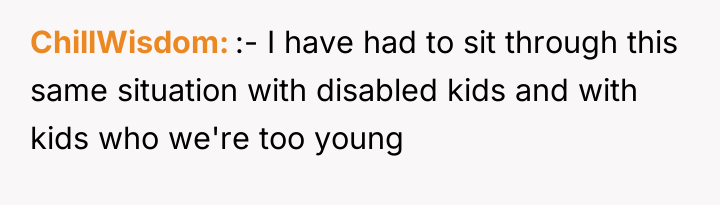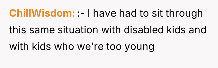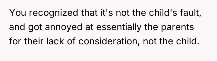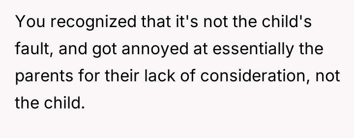 This situation highlights a common tension in public spaces involving differing needs and expectations. If the child has a disability or mental handicap, the parents are balancing their need to provide their son with an enjoyable outing against the social contract of public etiquette. The OP, while justified in seeking an undisturbed experience, must also consider the context. The child's behavior was involuntary, shifting the ethical burden primarily onto the parents to mitigate the impact on others. Their failure to remove the child after repeated disturbances suggests a breakdown in managing this boundary, perhaps due to emotional exhaustion or a feeling that they had a right to stay despite the disruption.