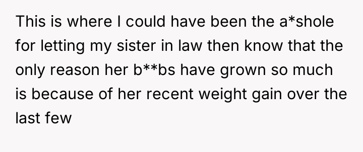 This situation highlights a failure in establishing and maintaining appropriate interpersonal boundaries, particularly within family dynamics. The sister-in-law crossed a clear boundary by mocking the girlfriend's body size publicly, likely driven by her own insecurities surrounding her weight gain and subsequent physical changes. The girlfriend reacted with understandable upset, while the OP, motivated by loyalty and anger on behalf of their partner, engaged in retaliatory verbal aggression. While the OP’s intention was protective, their response—disclosing the link between the sister-in-law’s breast growth and recent weight gain—was an aggressive counter-attack that violated social norms regarding sensitivity and privacy, escalating the conflict beyond repair in the short term.