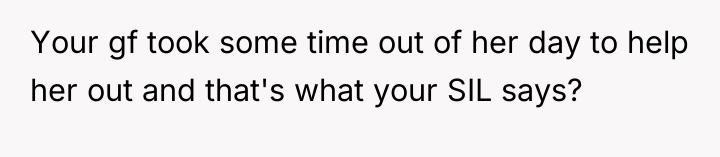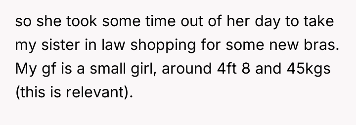 The original poster (OP) is experiencing conflict stemming from a direct confrontation intended to defend their girlfriend after the sister-in-law made a hurtful comment about the girlfriend's body size. The central conflict involves the OP prioritizing defending their partner's feelings over maintaining familial peace with the sister-in-law, whose expectation was likely continued positive interaction following the shopping trip.