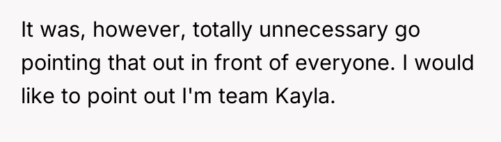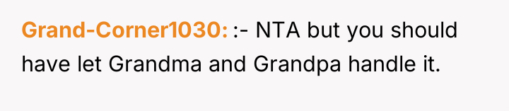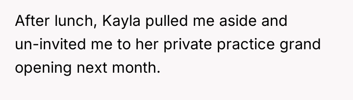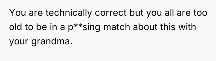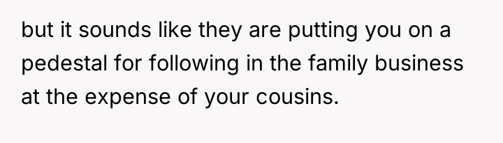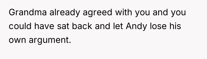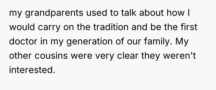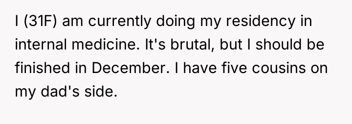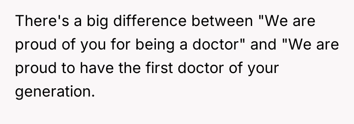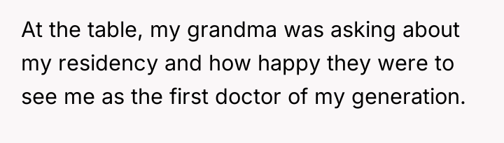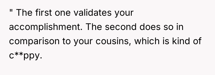 Grandpa's intervention acted as a temporary authority figure to quell the immediate argument, but Kayla’s subsequent exclusion of the OP demonstrates a failure in resolution and boundary negotiation from all parties. While the OP was justified in feeling recognized for their specific, arduous path, delivering that recognition by invalidating other colleagues' hard work was inappropriate. Moving forward, the OP should practice setting professional boundaries privately rather than engaging in public debates about professional equivalency. A constructive approach would be to acknowledge the hard work of all cousins while firmly defining their own role when appropriate, focusing on shared goals (patient care) rather than hierarchical competition.