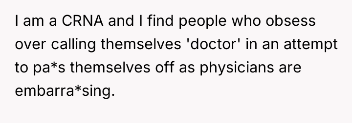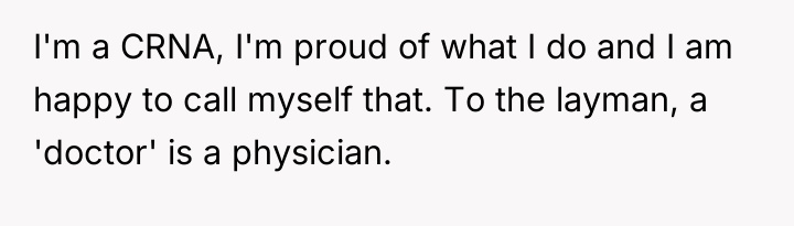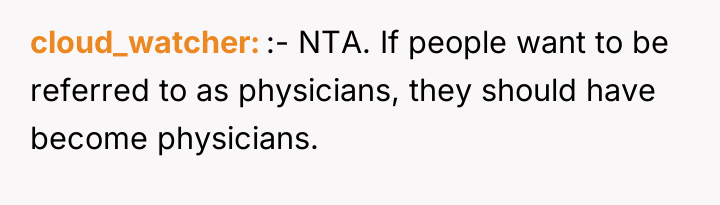 When family members with advanced healthcare training are recognized, is it appropriate for one person to use their status as a medical doctor to definitively exclude or diminish the professional achievements of others, or should the OP prioritize familial harmony over maintaining strict professional terminology?