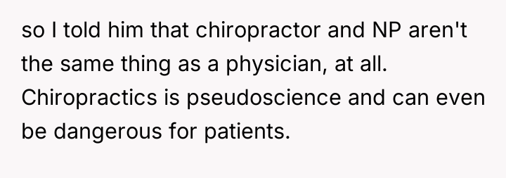 The original poster (OP) is facing a conflict rooted in professional hierarchy and family expectation, specifically regarding the definition and perceived value of various healthcare roles. While the OP asserted a strict distinction between medical doctors and other advanced practitioners (Chiropractors and NPs), this assertion led to hurt feelings, accusations of arrogance, and social consequences, such as being uninvited to an event.