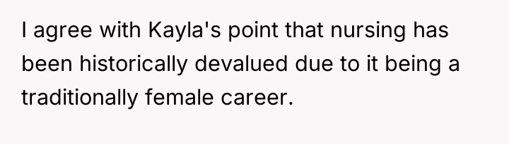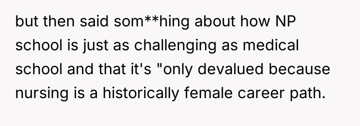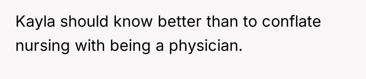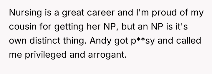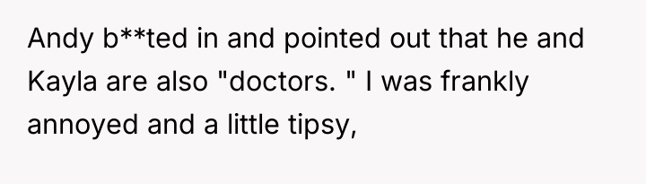 The core issue here involves professional identity, boundary setting, and the emotional labor within family dynamics. The OP, facing high-stress residency, likely felt protective of the status they are achieving after years of rigorous medical training. Andy’s interjection, positioning himself and Kayla as equivalent to a physician, directly challenged the hierarchical structure the OP and their family hold dear. The OP’s reaction, though perhaps factually accurate regarding the distinction between MD/DO and other advanced degrees, was delivered with poor timing and an aggressive tone when tipsy, escalating the situation from a minor slight to a public confrontation. Andy reacted defensively to perceived elitism, while Kayla's comment highlights a valid sociological critique regarding the devaluation of female-dominated professions, suggesting that the OP’s defensiveness might inadvertently reinforce existing gender biases in healthcare status.
