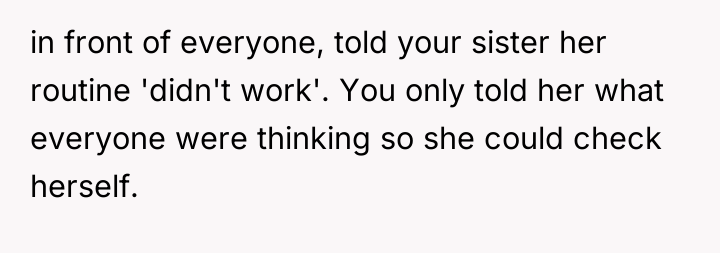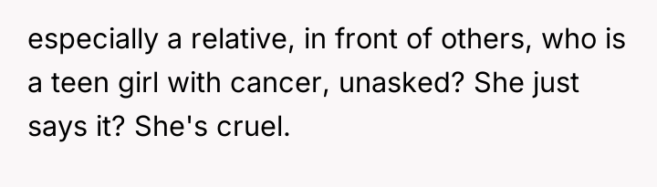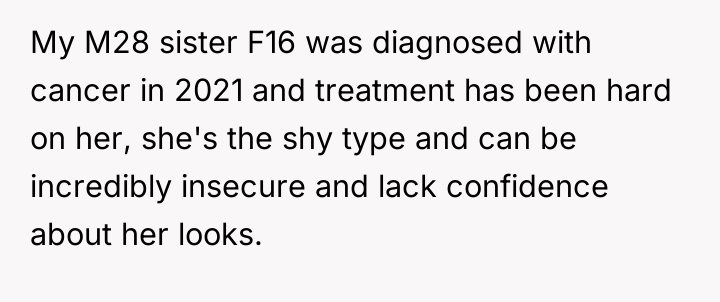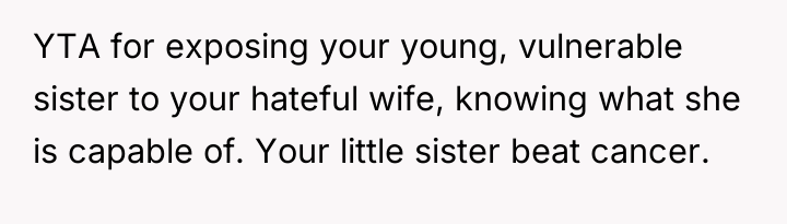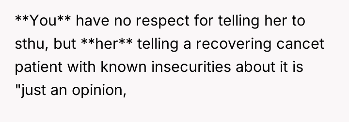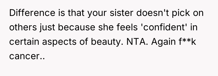 The Original Poster (OP) is clearly prioritizing the emotional well-being of his severely ill and insecure sister over his wife's feelings about how she was addressed. The central conflict arises because the wife believes she was offering unsolicited, though harsh, advice and feels disrespected by the OP's direct confrontation in front of family, while the OP felt compelled to defend his sister against a hurtful and inappropriate comment.