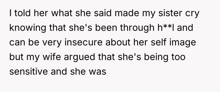 Was the OP justified in aggressively confronting his wife to defend his vulnerable sister against a cruel remark, or did his public reprimand cross a line and disrespect his wife's role in the relationship? The debate centers on where the boundary of acceptable speech lies when dealing with sensitive individuals versus the standard of respect owed to a spouse.