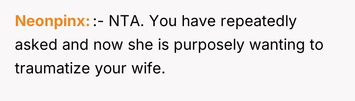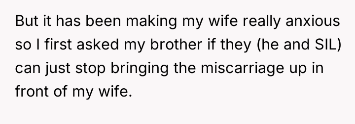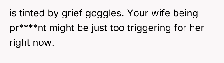 The core issue here is the intersection of grief processing and the need for safety in a vulnerable situation. The SIL is processing a significant trauma (losing a child near the current gestational milestone) and may be inadvertently using constant repetition as a coping mechanism. However, the OP's wife is experiencing a legitimate threat to her mental well-being due to her high-risk pregnancy, making the boundary setting imperative. The OP correctly identified the need for a boundary, but the execution failed when the direct request was ignored, leading to an emotional overflow.