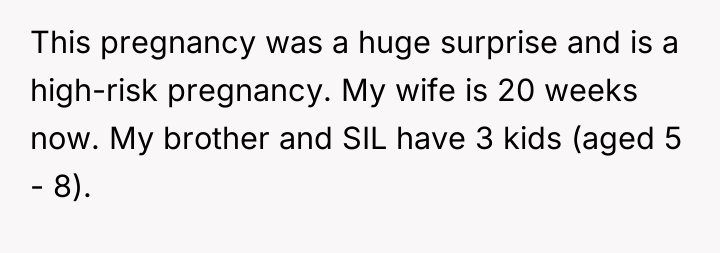 The original poster is facing a severe conflict between his duty to protect his anxious, pregnant wife and his desire to maintain peace with his brother's family, especially given the recent tragedy his sister-in-law experienced. His explosive reaction stemmed from repeated failed attempts to set a necessary boundary to safeguard his wife's mental health during a high-risk pregnancy.