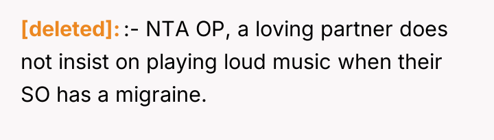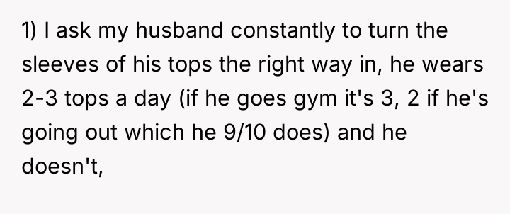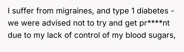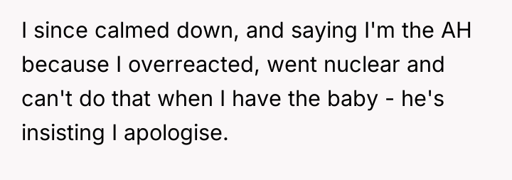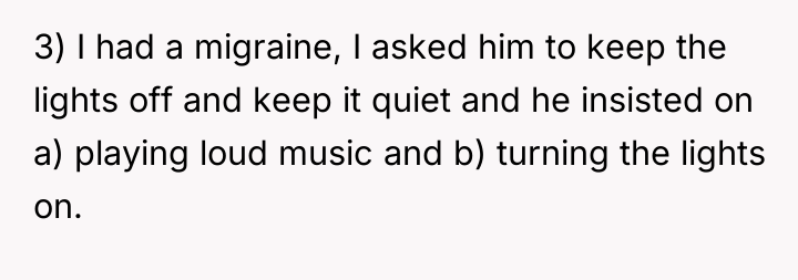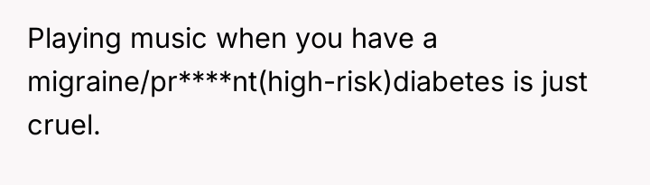 The OP is managing a high-risk pregnancy (Type 1 Diabetes, migraines) while simultaneously carrying the majority of the domestic load, indicated by the specific, repeated requests for help with sleeves, dishes, and quiet time during a migraine. The husband’s repeated refusal to comply with minor requests (sleeves, dishes) and active disregard for a major health need (migraine/loud music) suggests a significant deficit in empathy, awareness, or respect for the OP's physical limitations. The failure to empty the rubbish, leading to injury, served as the final trigger, causing the OP to 'go nuclear.' The husband's counter-accusation that the OP overreacted and cannot handle having a baby frames the OP's legitimate distress as a parental failing, shifting blame from his lack of contribution to her emotional response.