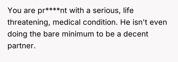 The original poster (OP) expressed extreme frustration due to feeling unsupported in managing household tasks and health needs while pregnant, leading to an immediate, high-stakes reaction where they demanded their husband leave. The central conflict lies between the OP's feeling that their requests for basic help were ignored and the husband's perception that the OP's reaction was an overreaction that showed poor judgment regarding future parenting responsibilities.