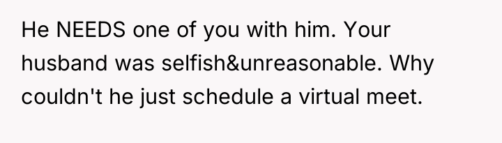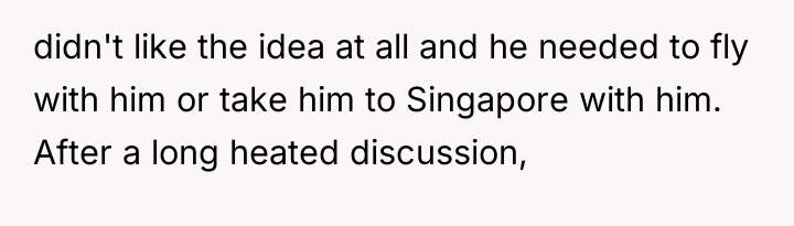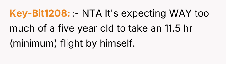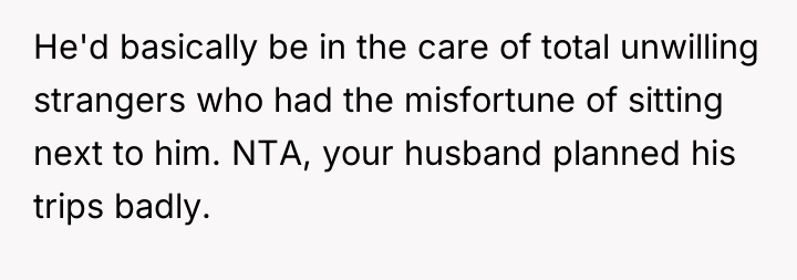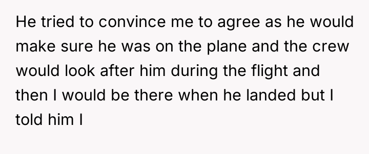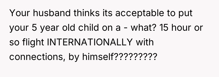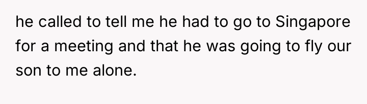 The original poster (OP) faced a situation where her husband unilaterally decided on a major logistical and childcare arrangement involving their young son traveling alone across continents. While the OP asserted her need to maintain proximity to her child, this decision led to significant tension and resentment from her husband, who felt his authority or planning was undermined.