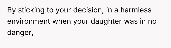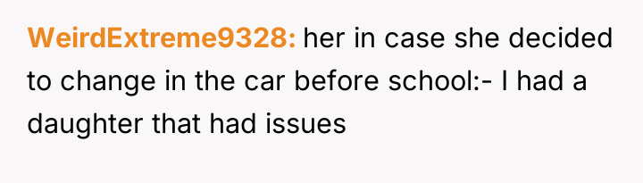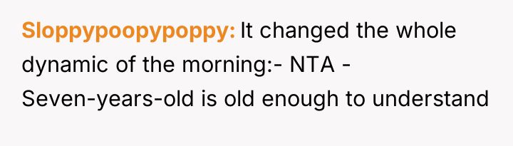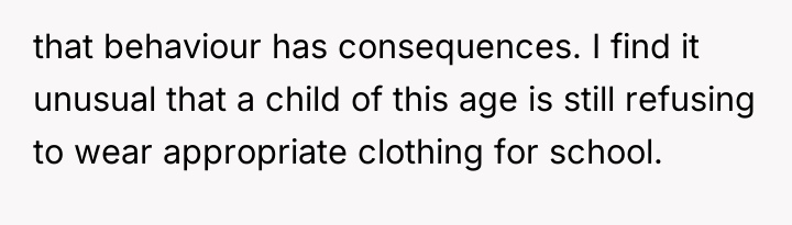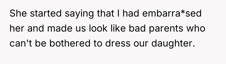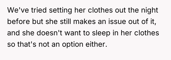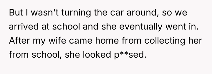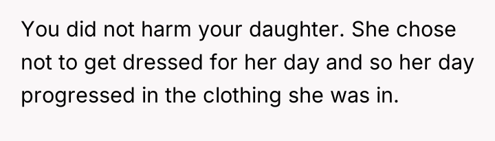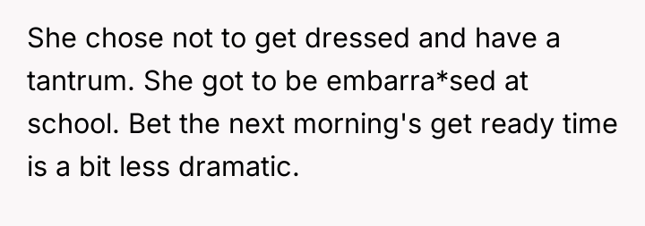 The core issue extends beyond the pajamas; it involves differing parenting philosophies and a breakdown in communication between the parents regarding discipline. The father bypassed the boundary (getting dressed) by accepting the non-compliance, while the mother prioritized maintaining social presentation and avoiding perceived emotional harm to the child. For future instances, the OP should aim for proactive boundary setting (e.g., implementing a clear, non-negotiable consequence *before* the morning struggle, such as choosing between two pre-approved outfits or accepting a specific, less public consequence if refusing). In the moment of high stress, a better approach is to pause the interaction, re-establish calm, and then enforce a pre-agreed consequence rather than making an on-the-spot decision that feels punitive to the child and creates marital conflict.