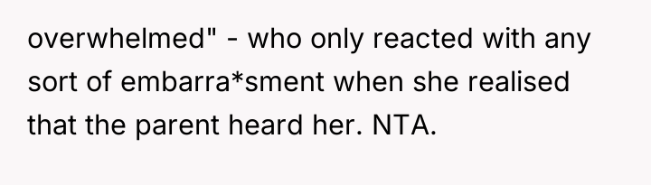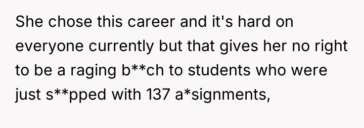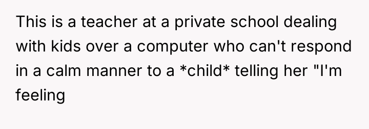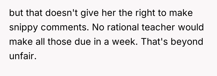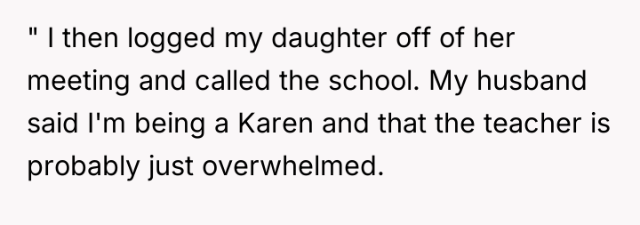 The teacher's dismissive response to the daughter's expression of feeling overwhelmed (“Well, life isnt fair, is it?”) is a textbook example of invalidation. This behavior erodes trust and signals to the student that their genuine emotional experience is irrelevant or inconvenient. The OP’s reaction, while emotionally charged, was a direct defense mechanism against witnessing their child being publicly dismissed by an authority figure, especially after days of intense, unsupported labor. While confronting the teacher over the camera was immediate, it stemmed from a protective parental instinct against emotional abuse under duress.