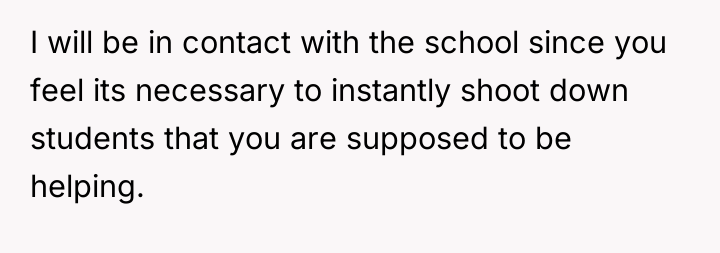 The OP’s action of immediately contacting the school was appropriate for documenting the teacher's unprofessional conduct, as clear professional standards must be maintained, regardless of teacher burnout. However, a constructive recommendation for future interactions would involve establishing a tiered communication protocol: first, addressing the workload issue calmly with the teacher via email (documenting the 5 am to 4 pm schedule), and only escalating to administration if the workload remains unsustainable or if unprofessional conduct regarding emotional validation is repeated.