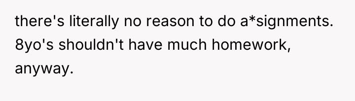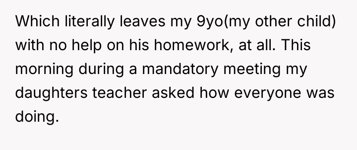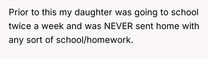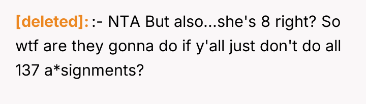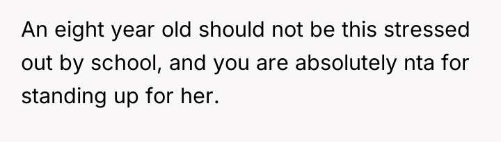 The original poster (OP) is clearly experiencing intense stress and frustration due to an unreasonable academic workload suddenly imposed on their eight-year-old daughter, compounded by an insensitive teacher. The central conflict lies between the OP's protective actions to advocate for their child against perceived mistreatment and the husband's view that the OP overreacted, suggesting the teacher's burnout should warrant more patience.