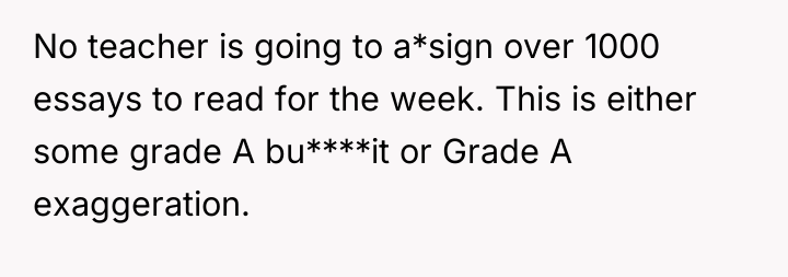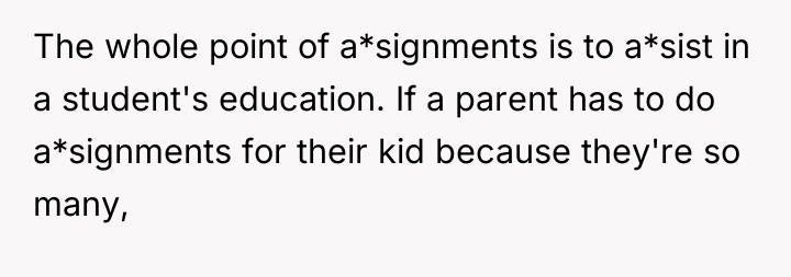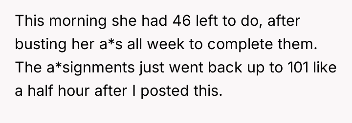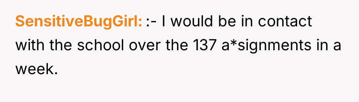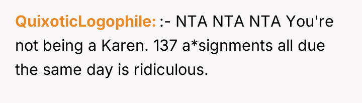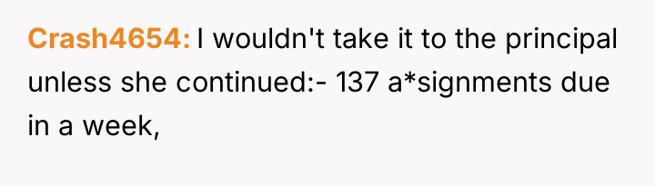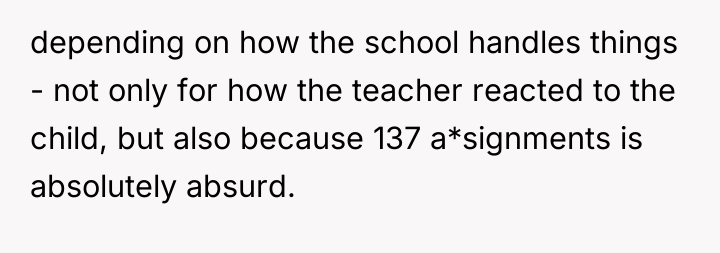 Was the OP justified in immediately escalating the situation by confronting the teacher and contacting the school over the inappropriate comment, given the context of the overwhelming assignment load, or did this reaction cross the line into being overly aggressive, as suggested by the husband?
