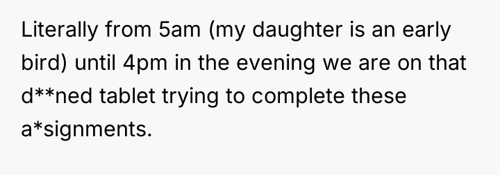 From dawn until dusk, they battle through endless tasks and mandatory Zoom meetings, racing against a clock that refuses to bend. The mother’s heart breaks witnessing her child’s early mornings and late afternoons consumed by screens, their lives reduced to a grueling cycle with no room to breathe or simply be a kid.