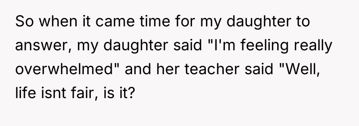 AITA for flipping out on my daughters teacher after she made the comment "Well, life isnt fair" in response to my daughter saying she was overwhelmed?