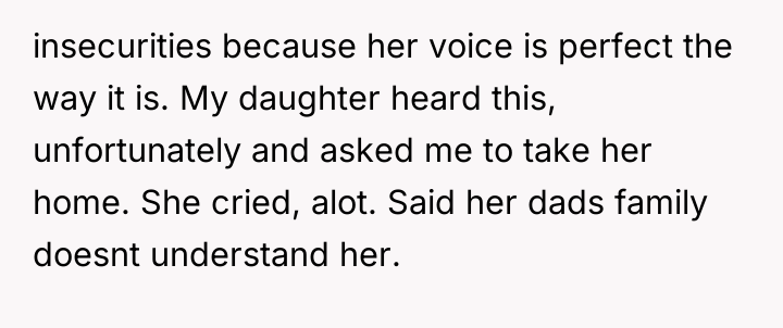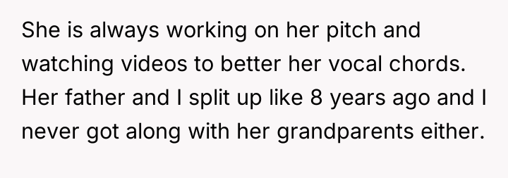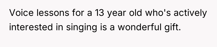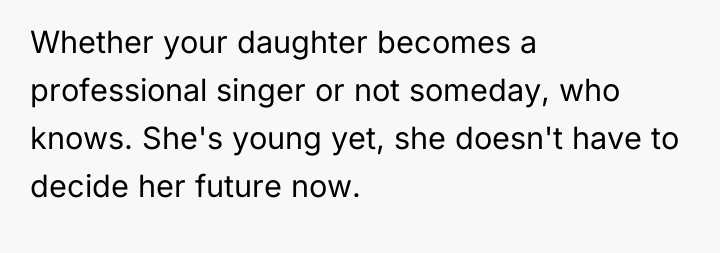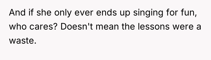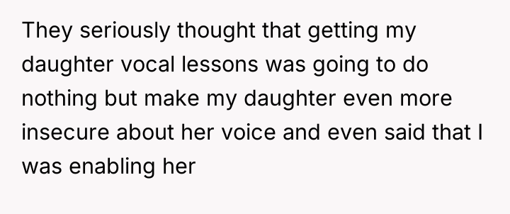 The OP’s action in purchasing the lessons was appropriate as it directly addressed the daughter’s expressed emotional distress and long-term goal. The mistake, if any, was in underestimating the family's capacity for negative reaction and not preparing the daughter for potential external criticism. Moving forward, the OP should focus on shielding the daughter from the extended family's negative commentary, reinforcing that parental support for passion is not a judgment on current skill level, and maintain the investment in the vocal coaching.