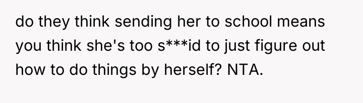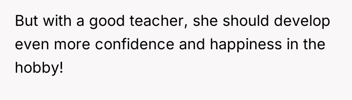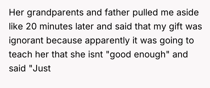 The father and grandparents' reaction suggests a defensive posture, perhaps rooted in their own anxieties or differing values regarding self-improvement versus self-acceptance. Their assertion that providing lessons implies the daughter isn't 'good enough' is a classic example of projection or a fear that the daughter’s dedication signals a need to leave their sphere of influence. Furthermore, the father's subsequent threat regarding child support payments introduces a manipulative power dynamic aimed at controlling the OP’s independent decisions.