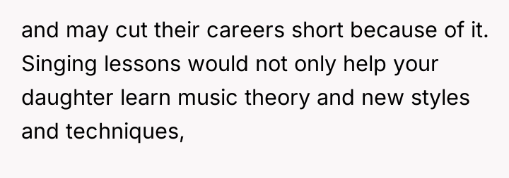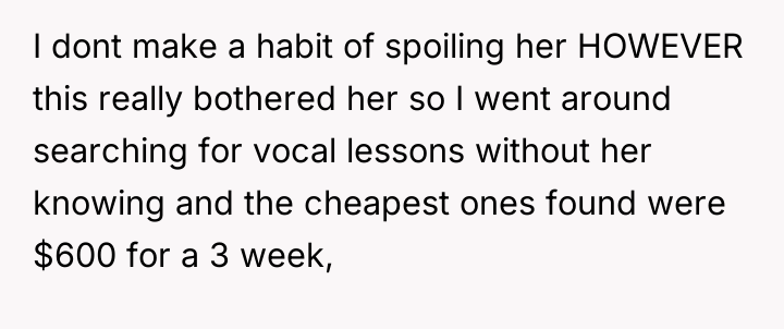 AITA for dropping $600 on vocal lessons for my 13 year old daughter?