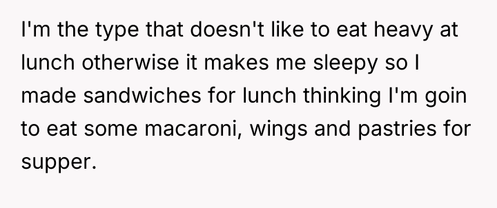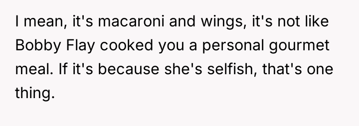 This situation involves a clear breakdown in managing shared resources and a failure to respect implied boundaries regarding consumption. The OP was looking forward to specific components of the leftovers (macaroni, wings, pastries) based on the understanding that the large quantity would last for the week, especially given his specific lunch/dinner preferences. The partner’s rapid consumption, culminating in eating everything, suggests a lack of consideration for the OP's future needs or a failure to communicate about the division of leftovers immediately following the party. Her response—that it is 'just food' that can be easily replaced—minimizes the OP's feelings of being deprived and ignored, shifting the focus from equitable sharing to the ease of repurchase. The OP's strong reaction, while perhaps elevated by anger, stems from feeling that his expectations about planning and fairness were violated.